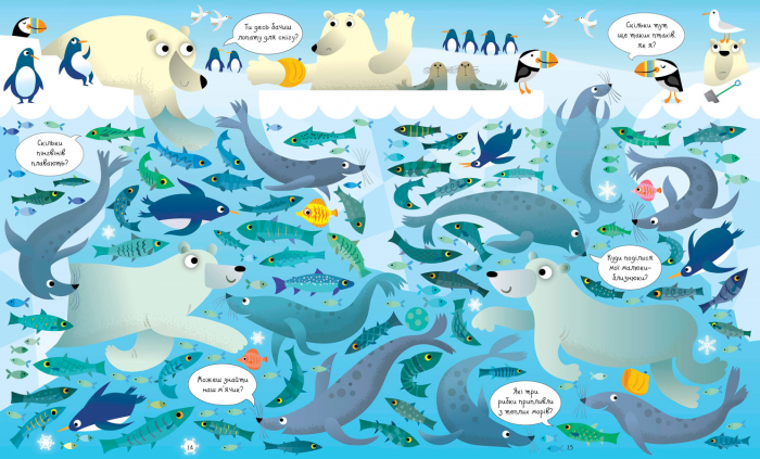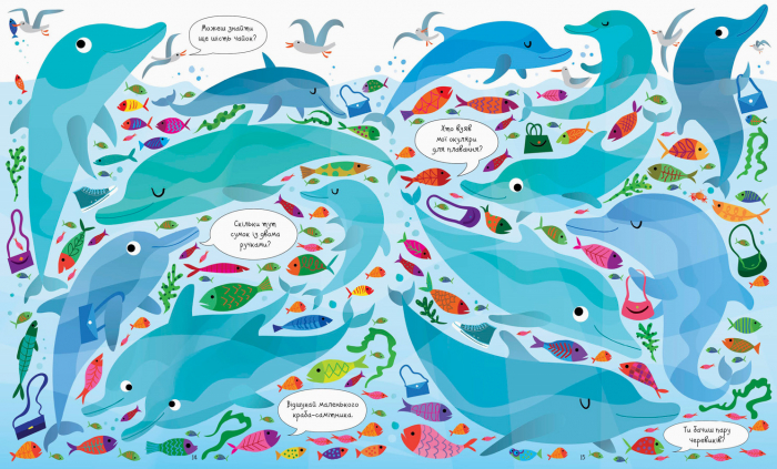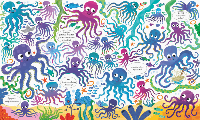 Запрошуємо найуважніших та найдопитливіших зануритися в дивовижний світ морських пригод! На кожній сторінці цієї ілюстрованої книги — безліч морських мешканців, а також різноманітних предметів та цікавих деталей, які треба знайти, порівняти та порахувати.