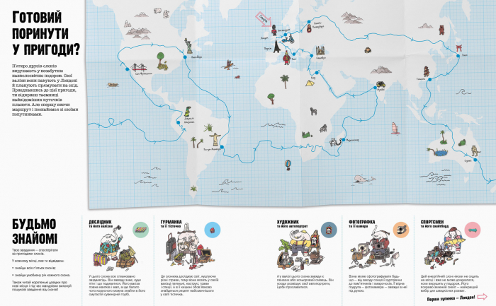 Слони-мандрівники запрошують тебе в незабутню навколосвітню подорож. Ти відвідаєш безліч унікальних місць — від хмарочосів Сіднея, Нью-Йорка і Токіо до амазонських джунглів і диких лісів Мадагаскару. Кожна зупинка подорожі — це можливість побачити визначні пам’ятки, познайомитися з місцевою культурою, скуштувати національні смаколики і відшукати сотні цікавих деталей.