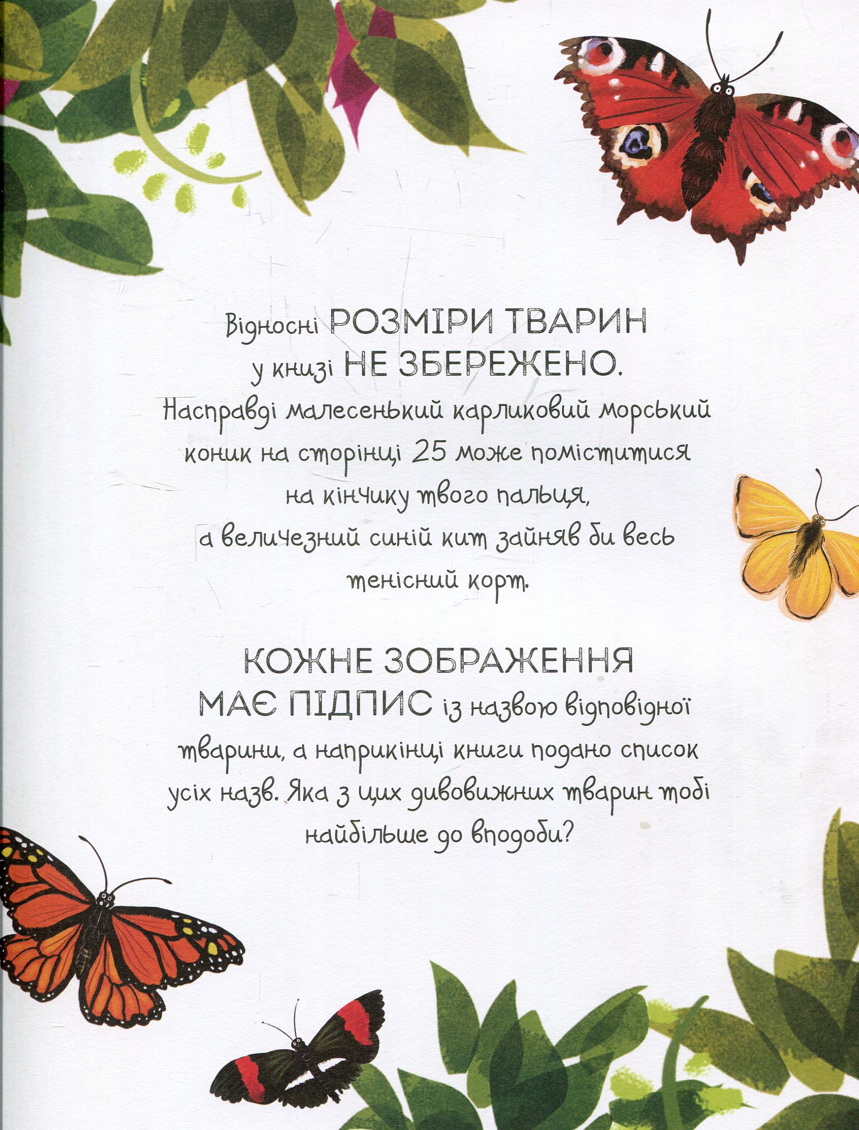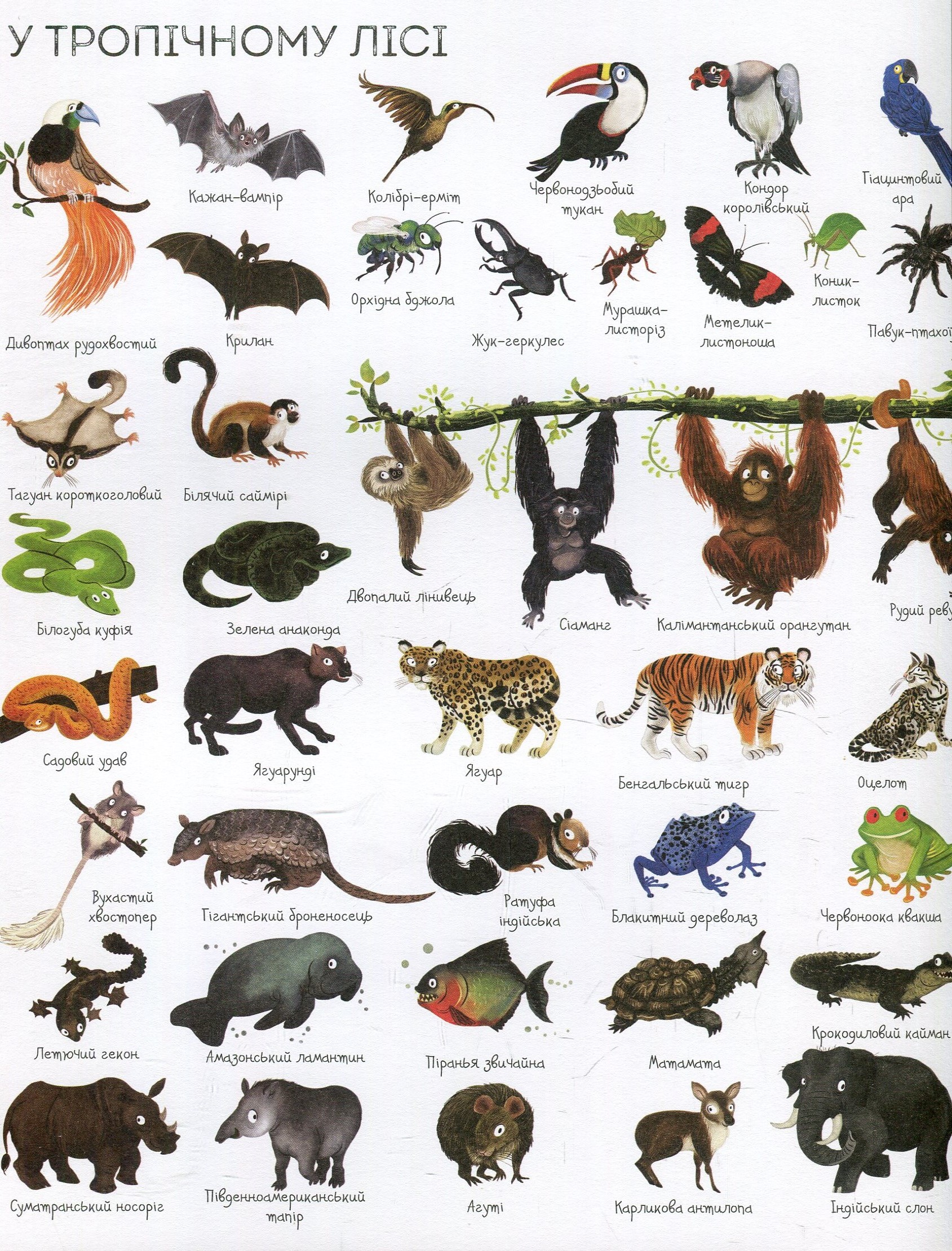 На нашій планеті живе понад мільйон різних видів тварин, і це лише відомі нам. Цілком імовірно, що окрім них існують мільйони, про які ми ще нічого не знаємо. У цій книзі наведено 1000 назв тварин — від загальновідомих, що мешкають на фермах, до надзвичайних і дивних створінь у глибоких темних водах океанів. Дізнатися їх та запам’ятати – надійний спосіб додати до свого слов- никового запасу 1000 слів. Кожне зображення має підпис із назвою відповідної тварини, а наприкінці книги подано список усіх назв.