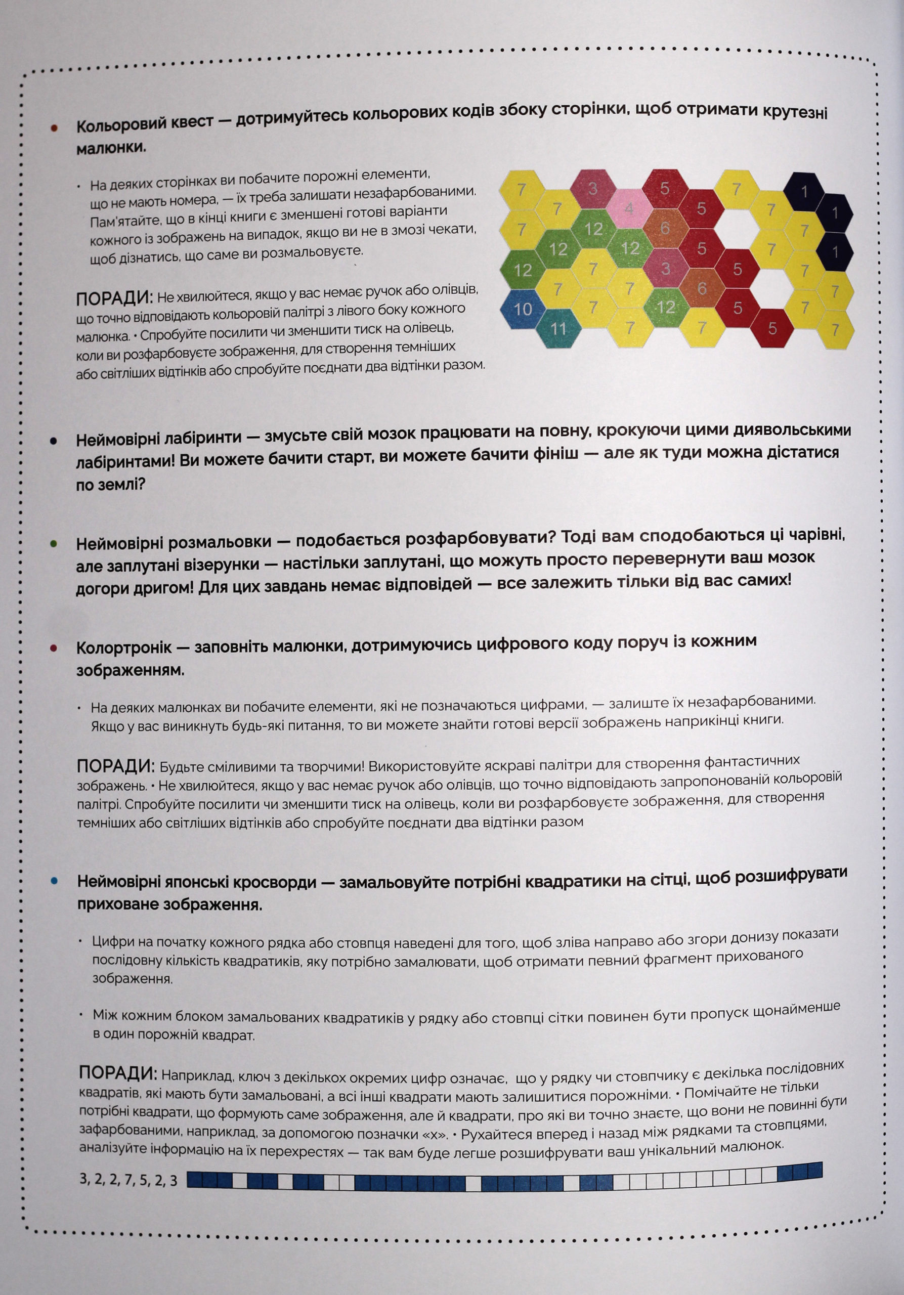 Шість різних видів креативної актівності в одній книгі: малюнок від точки до точки, розмальовка за номерами, кольоровий квест-розмальовка, лабіринти, антістресс-розмальовки із вигадливими візерунками та судоку. Найкращий спосіб відволіктися від буденних справ та урізноманітнити відпочинок.