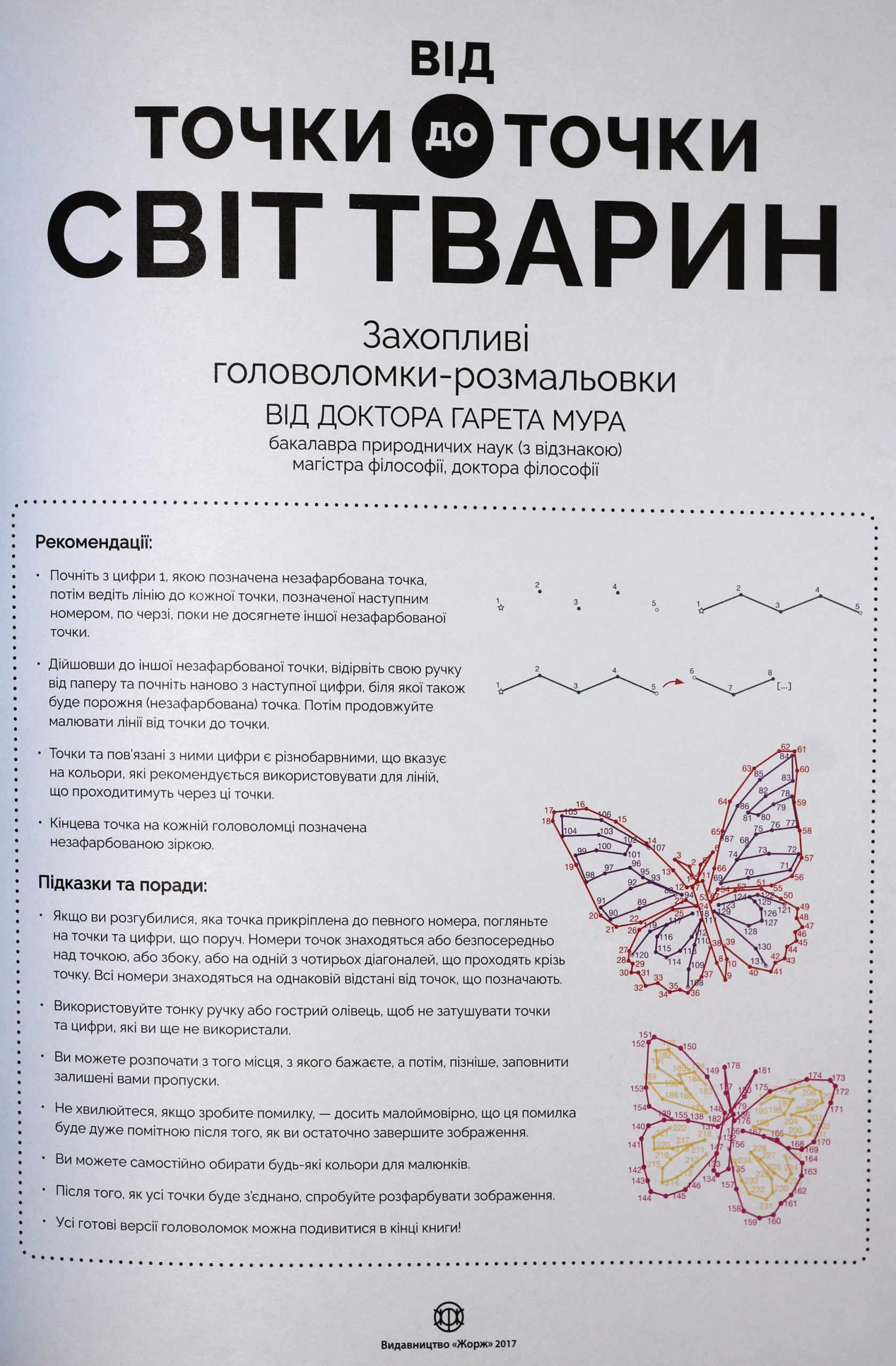У цій книзі можна відтворити 30 складних малюнків, з’єднавши точки у вказаній послідовності. Від файних котиків і чарівних птахів до величних хижаків і чудернацьких комах — неймовірна колекція для любителів малювання та шанувальників головоломок.