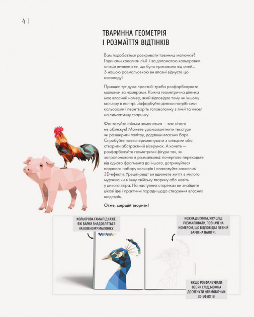Принцип тут дуже простий: треба розфарбовувати малюнки за номерами. Кожна геометрична ділянка має власний номер, який відповідає тому чи іншому кольору в палітрі. Зафарбуйте ділянки потрібними кольорами і перетворіть головоломку з ліній та чисел на симпатичну тваринку. Фантазуйте скільки заманеться — вас нічого не обмежує! Можете урізноманітнити текстури чи розширити палітру, додавши власних барв.